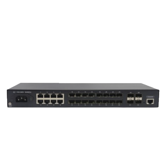 二层网管准工业级,16口千兆光SFP,8口千兆电,4口千兆光电复用接口;支持VLAN;宽温(-30℃-70℃),内置电源,1U机架式-AC220V输入